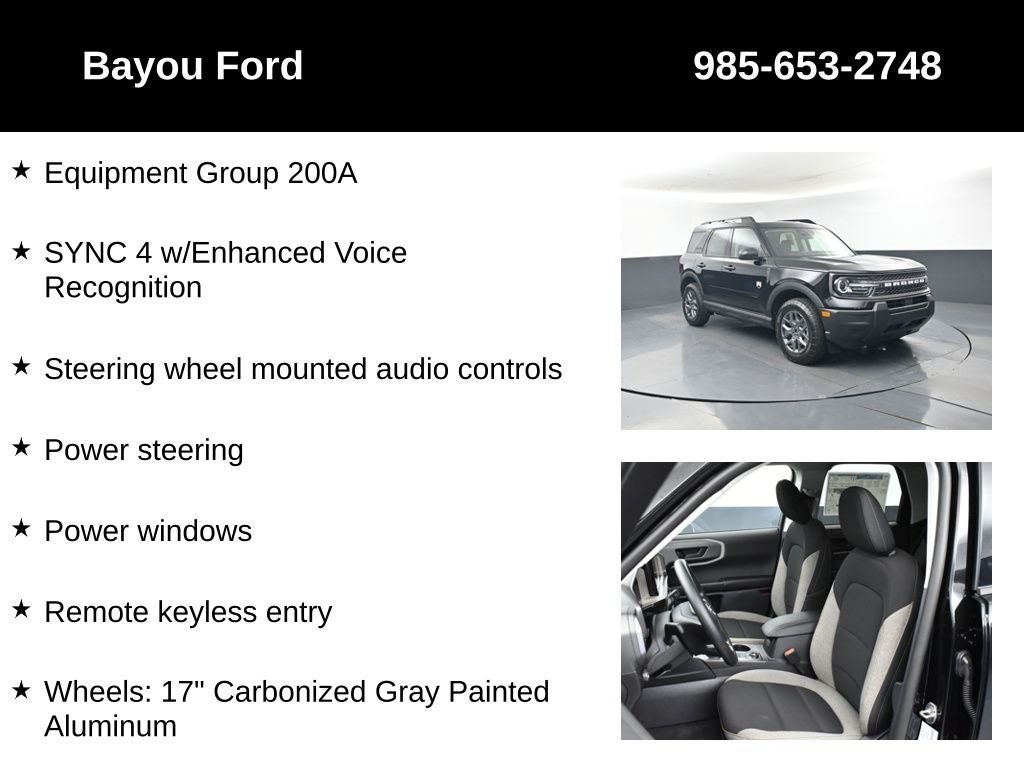 Bronco Sport Big Bend 200A, 4D Sport Utility, 1.5L EcoBoost, 8-Speed Automatic, 4WD, Shadow Black, Medium Light Smoked Truffle w/Cloth w/Easy-to-Clean Front Bucket Seats, Equipment Group 200A, Power steering, Power windows, Remote keyless entry, Steering wheel mounted audio controls, SYNC 4 w/Enhanced Voice Recognition, Wheels: 17 Carbonized Gray Painted Aluminum.
