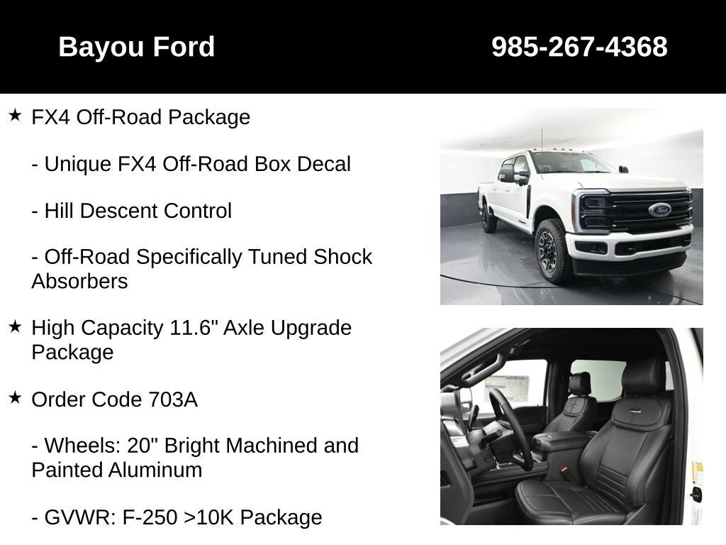 F-250SD Platinum 703A, 4D Crew Cab, 6.7L High Output Power Stroke V8 Diesel, 10-Speed Automatic, 4WD, Star White Metallic Tri-Coat, Black Onyx/Platinum Blue w/Unique Platinum Leather 40/Console/40 Seats, Alloy wheels, FX4 Off-Road Package, Heads-Up Display, High Capacity 11.6 Axle Upgrade Package, Hill Descent Control, LED Roof Clearance Lights, Off-Road Specifically Tuned Shock Absorbers, Order Code 703A, Pro Power Onboard - 2kW, Radio: B&O Unleashed Sound System by Bang & Olufsen, SecuriCode Wireless Keyless Entry Keypad, Twin Panel Power Moonroof, Unique FX4 Off-Road Box Decal, Upfitter Switches (6).
