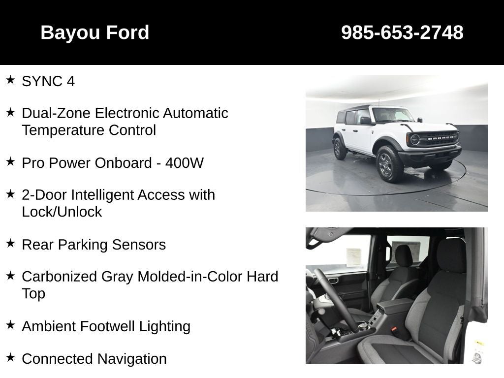 At Bayou Automotive, we're proud to offer this exceptional 2026 Ford Bronco Big Bend 222A. With its uncompromising performance, advanced technology, and head-turning style, this SUV is the ultimate expression of capability and refinement. We invite you to experience the Bronco for yourself and discover why it's the perfect vehicle to elevate your adventures.