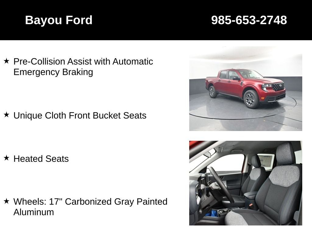 Whether you're navigating the city streets or tackling rugged terrain, the 2026 Ford Maverick XLT 302A is the perfect companion to elevate your driving experience. We invite you to visit our showroom and experience the exceptional capabilities of this remarkable compact pickup truck firsthand. Price includes: $500 - Retail Customer Cash. Exp. 03/31/2026