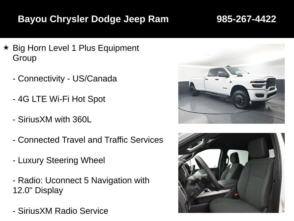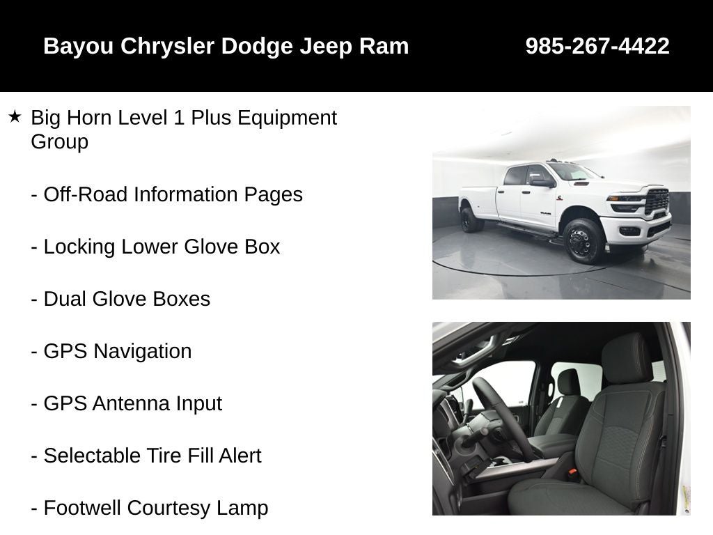 3500 Big Horn, 4D Crew Cab, 6.7L I6, 8-Speed Automatic, 4WD, Bright White Clearcoat, Black Cloth, 12 Touchscreen Display, 2 Way Rear Headrest Seat, 2nd Row in Floor Storage Bins, 4 Way Front Headrests, 40/20/40 Split Bench Seat, 4G LTE Wi-Fi Hot Spot, 9 Alpine Speakers with Subwoofer, Air Conditioning ATC with Dual Zone Control, Alexa Built-in, Apple CarPlay, Auto Power-Folding Mirrors, Auto-Dimming Rear-View Mirror, Big Horn Level 1 Plus Equipment Group, Black Exterior Mirrors, Black Exterior Truck Badging, Black Interior Accents, Black Wheel Center Hub, Body Color Grille Surround, Cloth 40/20/40 Premium Bench Seat, Cold Weather Group, Connected Travel and Traffic Services, Connectivity - US/Canada, Disassociated Touchscreen Display, Dual Glove Boxes, Emergency Vehicle Alert System (EVAS), Engine Block Heater, Exterior Mirrors Courtesy Lamps, Exterior Mirrors with Heating Element, Exterior Mirrors with Supplemental Signals, Foam Bottle Insert (door Trim Panel), Folding Flat Load Floor Storage, Footwell Courtesy Lamp, For Details Visit DriveUconnect.com, For More Info, Call 800-643-2112, Forward and Reverse Utility Lights, Front Armrest with Cupholders, Front Center Seat Cushion Storage, Front Seat Back Map Pockets, Global Telematics Box Module, Gloss Black Nostrils/Molded in Color Black Grille, Glove Box Lamp, Google Android Auto, GPS Antenna Input, GPS Navigation, HD Radio, Integrated Voice Command with Bluetooth®, LED Bed Lighting, Locking Lower Glove Box, Luxury Steering Wheel, Manual Adjust 4-Way Front Passenger Seat, Mirror Running Lights, MOPAR Deployable Bed Step, MOPAR Spray in Bedliner, MOPAR Winter Front Grille Cover, Night Edition, Off-Road Information Pages, Painted Front Bumper, Painted Rear Bumper, Power 2-Way Driver Lumbar Adjust, Power Adjust 8-Way Driver Seat, Power Adjust Mirrors, Power Heated Fold Telescopic Mirrors, Power Telescoping Mirrors, Power-Adjustable Convex Aux Mirrors, Quick Order Package 24Z Big Horn, Radio: Uconnect 5 Navigation with 12.0 Display, Rear 60/40 Folding Seat, Rear Dome with on/Off Switch Lamp, Remote Start System, Remote USB Port - Charge Only, Selectable Tire Fill Alert, SiriusXM Radio Service, SiriusXM with 360L, Steering Wheel Mounted Audio Controls, Storage Tray, Trailer Tow Pages.