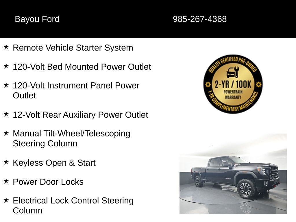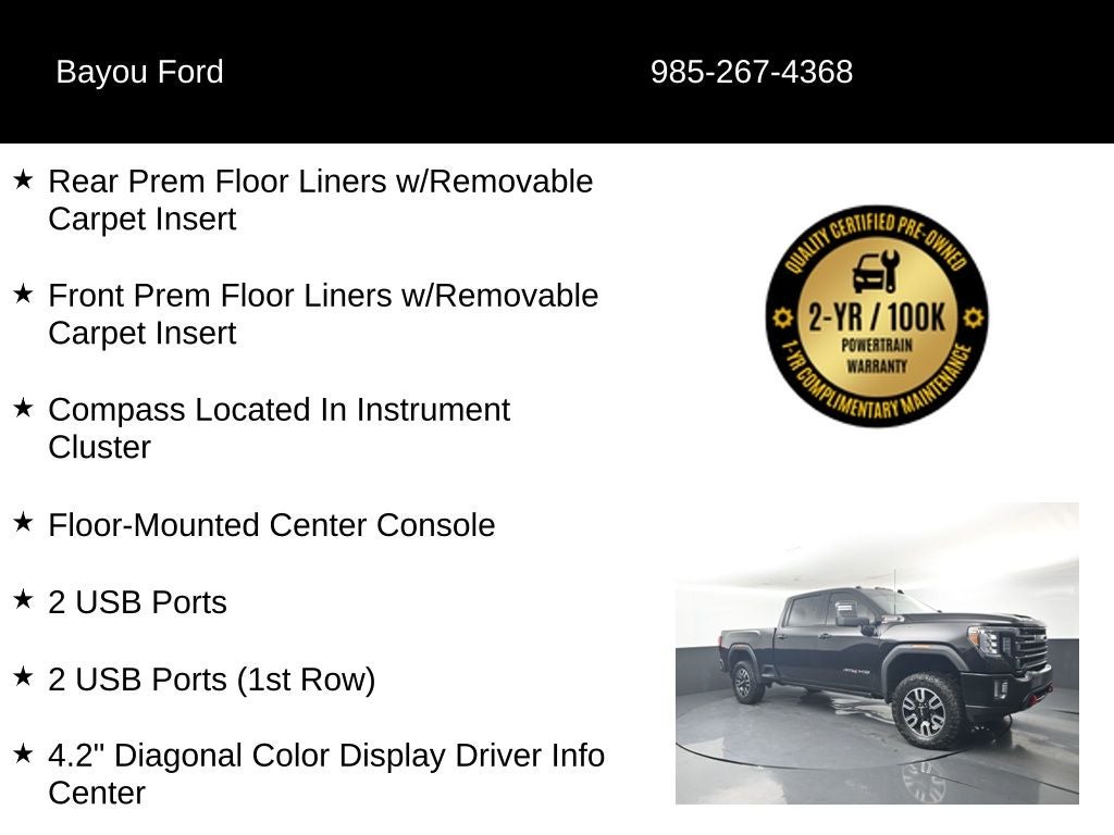 Certified by Bayou Automotive, this 2023 GMC Sierra 2500HD AT4 has undergone a rigorous 100-point inspection and comes with a complimentary 2-year or 100,000-mile Powertrain Warranty. With its uncompromising capability, premium features, and our commitment to your satisfaction, this Sierra is the perfect choice for your next adventure.